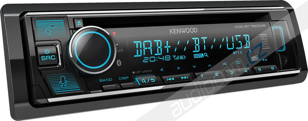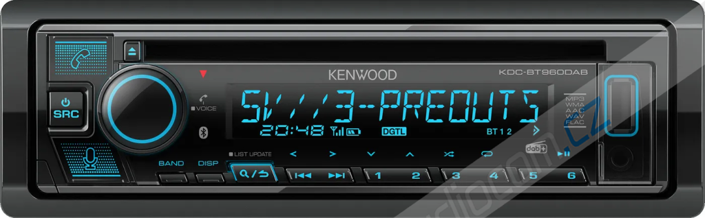Bezmechanikové autorádio s MP3/WMA/FLAC/AAC a předním USB vstupem, FM i DAB tuner, Bluetooth, AUX vstup, podpora iPod/iPhone a Android, měnitelné podsvícení, záložní paměť, modelová řada 2020