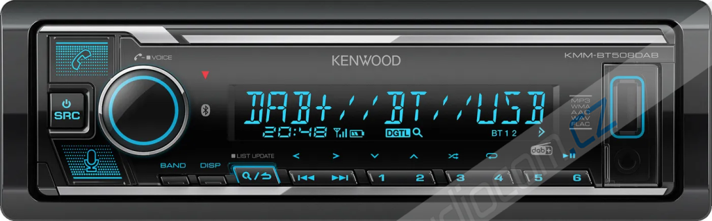 Bezmechanikové autorádio s MP3/WMA/FLAC/AAC a předním USB vstupem, FM i DAB tuner, Bluetooth, AUX vstup, podpora iPod/iPhone a Android, měnitelné podsvícení, záložní paměť, modelová řada 2020