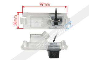 CCD zadní parkovací kamera pro instalaci do lampy pro osvětlení zadní registrační značky. Součástí kamery je místo pro umístění patice se žárovkou z původního světla pro registrační značku.