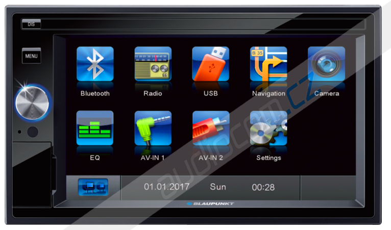 Bezmechanikové 2DIN autorádio, přední USB vstup, AUX a slot na SD karty, kvalitní antireflexní displej, bílé podsvícení, paměť pro předvolené stanice, 4-kanálový předzesilovač, bluetooth handsfree a audio streaming, vstup pro zadní parkovací kameru, součástí dálkový ovladač, nejnovější mapy Evropy
