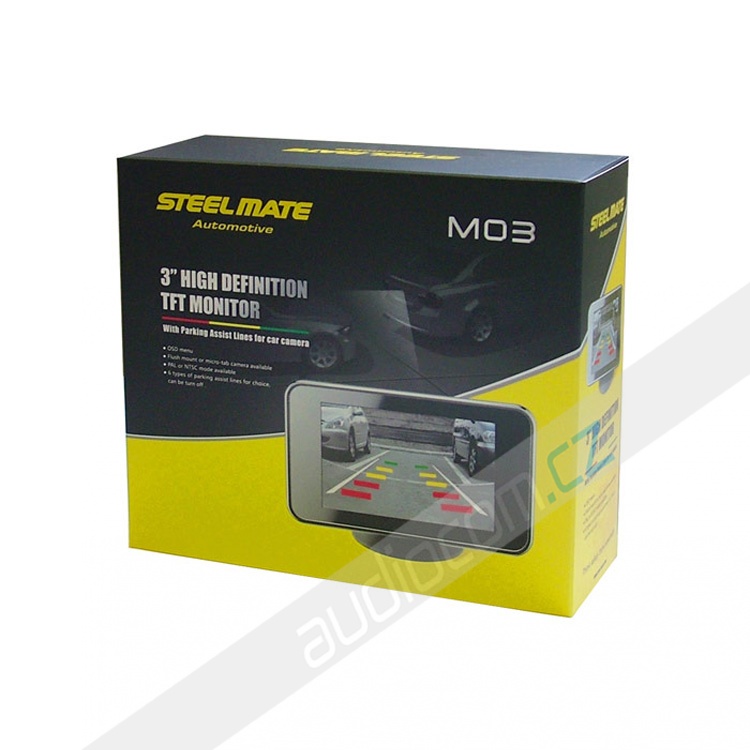 Samostatný 3" barevný TFT monitor STEELMATE M03. Slouží k ulehčení parkování a couvání s motorovým vozidlem. Na displeji se zobrazí prostor za vozem s pomocnými čarami.